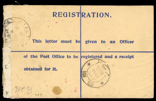 POSTAL HISTORY: 1944 15c blue registered postal stationery envelope (size G) with red Kanji overprint, to Singapore,