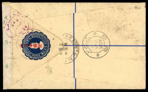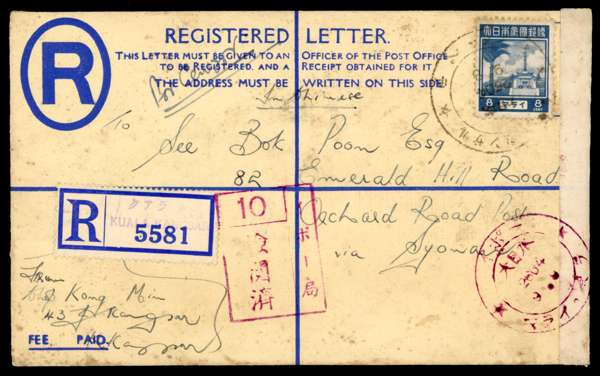 POSTAL HISTORY: 1944 15c blue registered postal stationery envelope of Perak (size G) with red Kanji overprint to Singapore from Kuala Kangsar, uprated by 8c War Memorial with cherry red Ipoh transit and censor with sealing tape at right, overall soiling still attractive.