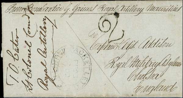 POSTAL HISTORY: 1852 entire letter from Port Louis addressed to the Royal Military Asylum, London, endorsed '' From Bombardier G. Grimes, Royal Artillery, Mauritius" and countersigned, with Packet Letter Mauritius d/s at foot for FE (??) 1852, sent unfranked and charged 2d (twice the penny soldier's concession rate); very fine, a scarce early soldier's letter.