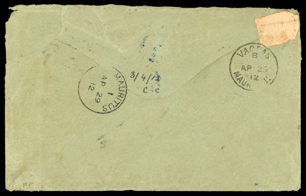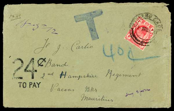 POSTAL HISTORY: 1912 incoming under-franked cover from Wynberg Cape, franked 1d with large “T” handstamp in blue and ms “40”. “24c/TO PAY” handstamp in blck applied on arrival with on reverse both Mauritius and Vacoas arrival “AP 29 12”.