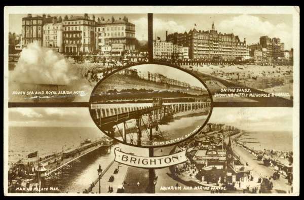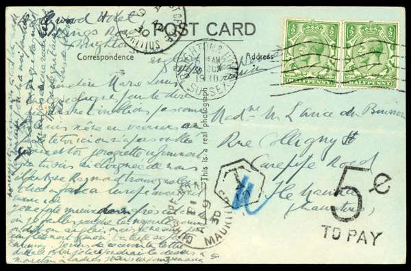 POSTAL HISTORY: 1930 ppc Brighton to Mauritius franked 2x½d green, underpaid , showing hexagonal “T/10” handstamp in black. Taxed on arrival in Port Louis with superb “5c/TO PAY” handstamp in black (Proud UP17) - the earliest recorded usage by eleven months. Post Office Mauritius and Curepipe Road arrival markings for “AU 9 30”.