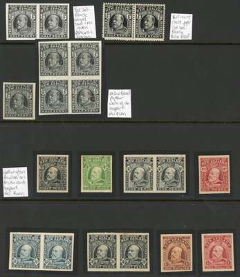 1915-33 proofs with ½d black Perkins Bacon imperforate pair on card; perf 14 x 15 gummed, watermarked pair on surfaced paper; block of four and single on unsurfaced, watermarked paper, no gum. Also Wellington printings imperforate; on thick card ; 3d black, 4d green (stained), 5d black pair, 6d carmine, 8d blue pair, 8d black pair (stained), 1/- brown and 1/- carmine