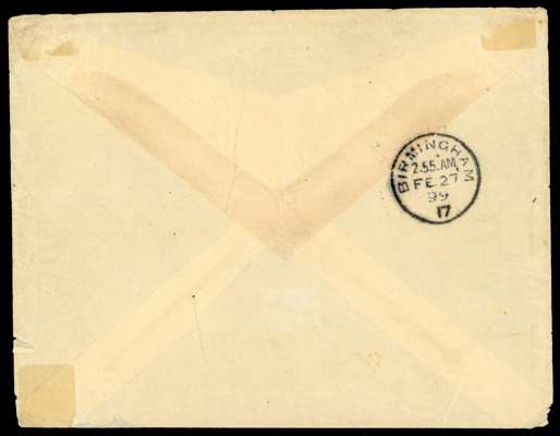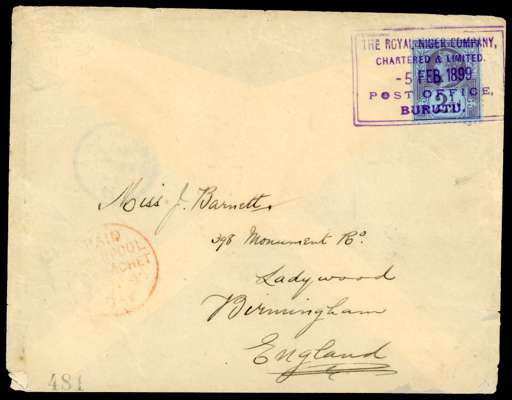 1899 envelope to Birmingham with 2½d Jubilee, tied by good almost-complete strike of Burutu boxed violet cancel with serifed lettering. The envelope slightly wrinkled, some edge wear and a small reinforcement. SG Z59