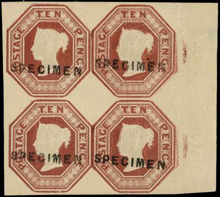 GB: 1848 10d red brown (Die W.W.1.) four margin right hand marginal block of 4 overprinted “SPECIMEN”