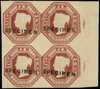 1848 10d red brown (Die W.W.1.) four margin right hand marginal block of 4 overprinted “SPECIMEN” type 1. Superb unused o.g. Ex Beresford SG 57sp