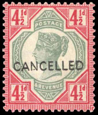 1892 4½d green and carmine overprinted “CANCELLED” type 14, good colour, fine o.g. SG 206var/Spec K34t £1,500