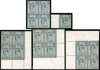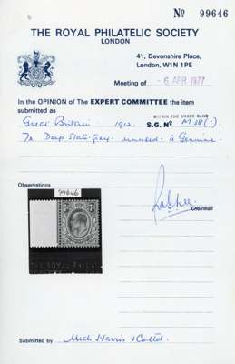 1902-13 Selection of 7d stamps on old dealer cards including 1910 DLR grey-black block of 4 (Spec. M37(1)), 1912 Somerset House deep slate-grey (1977 RPS cert, Spec. M38(1)), slate-grey block of 4 with date cut in margin (Spec. M38(2)), pale grey block of four (2, one with date cut in margin, Spec. M38(3)). A fine group and one for the KEVII specialist.