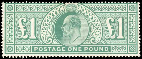 1902-10 DLR £1 dull blue-green, large part o.g. A few toned perfs at foot, otherwise fine. SG 266, £2,000