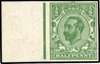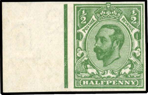 1911-12 ½d green, left marginal imperforate plate proof on Multiple Cypher watermarked paper, large part o.g with a couple of light gum wrinkles. A scarce trial. GB Vol II, page 93.