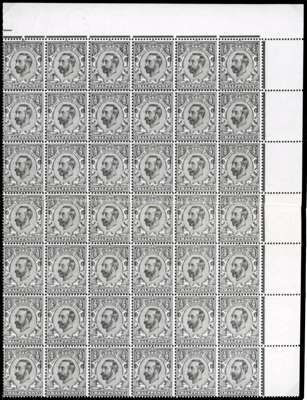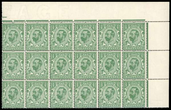 1911 Downey Head, ½d bluish green (Die 1B) wmk Crown, top right corner marginal block of 18, unmounted o.g. with light creasing and bends affecting a few stamps, not detracting from otherwise fine appearance. A difficult shade, RPS Certificate (1989), certifying a block of 42 from which this block was taken. SG 326 Spec. N2(8), £4680+