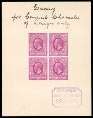 1913 8d Eve's Pillar Design essay, imperforate block of four printed in magenta on simple cypher watermarked paper, mounted on white card (88 x 114mm) endorsed "Essay for General Character of Design only" at top and with "Stamping Department 29 JAN. 1913" purple handstamp at lower right. Fig. 33a. Most attractive and rare. SG 390var