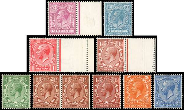 1912-24 mint selection comprising 6d reddish purple ‘WATERMARK INVERTED’ and 10d turquoise-blue ‘WATERMARK INVERTED AND REVERSED’, 1d, 1½d both with extended margins and coarse printings with ½d, 1½d (3, with a pair), 2d and 2½d; all part to large part og. Fair to fine. (10)