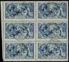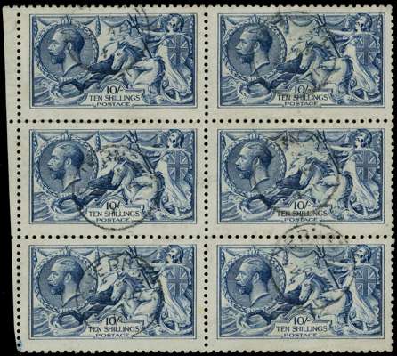 1915 10s Deep blue (Worn plate). Very fine and fresh used left hand marginal block of six cancelled by Guernsey cds's. Wonderful plate wear, very scarce in this quality. Spec. N70(8).