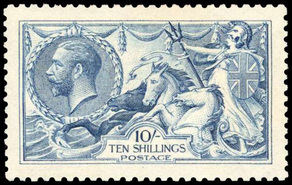 1915 De La Rue 10s pale blue, large part og. Well centred with fresh appearance. SG 413