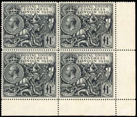 1929 £1 black PUC lower right hand corner marginal block of 4, fine facial appearance, a few trifling gum bends otherwise fine unmounted o.g. SG 438