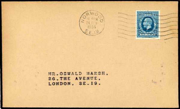 1934-36 Photogravure 10d tied to plain Marsh envelope by very neat Norwood S.E.19 machine cancel