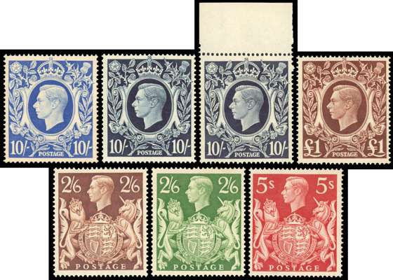 1939 square set to £1 including 10s ultramarine and two 10s dark blues, fresh appearance with some gum toning otherwise unmounted o.g. (7) SG 476/478c
