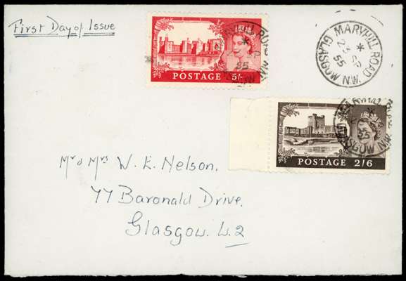 1955 Waterlow Castles pair of First Day Covers, the 10s and £1 values tied to cover by King St. cds for 1 SP and the 2s6d and 5s values tied by Maryhill Road cds for 23 SP. A scarce and attractive pair. SG 536/539, £1500.