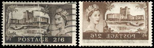 1967-68 No watermark 2s6d blackish brown, showing offset on reverse, fine unmounted og. Also 1963 BW 2s6d showing pre-printing paper fold, used. SG 759var, 595avar