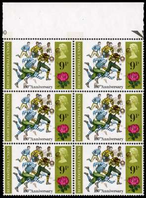 1971 Anniversaries 9p Rugby Football Centenary top marginal block of 6 (2x3) with spectacular shift of olive brown,