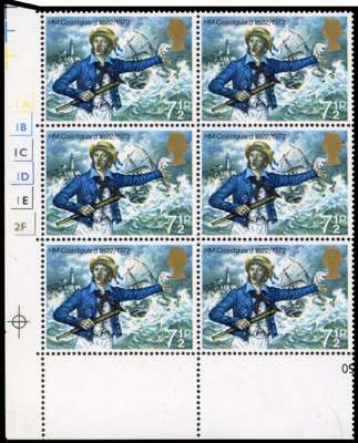 1972 Anniversaries, 7½p 19th-century coastguard lower left hand corner marginal block of 6, phosphor omitted