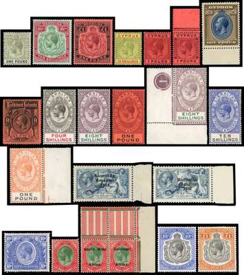 KGV mint selection on Hagners including Bahamas 1912 £1, Bermuda 1918 10s and £1, Cyprus 1923 10s and £1, 1924 £1 top marginal example, 1928 £1 50th Anniversary of British Rule bottom marginal example, Falkland Is 1912 £1, Gibraltar 1912 4s, 8s and £1, 1921 8s lower left corner marginal example, 1925 10s and £1, Ireland 1922 10s, 1925 10s, KUT 1922 10s, South Africa 1916 £1, South West Africa 1923 £1 pair, top right gutter/marginal pair, Tanganyika 1927 10s and £1, fine facially, slightly mixed condition still most good to fine. (21)
