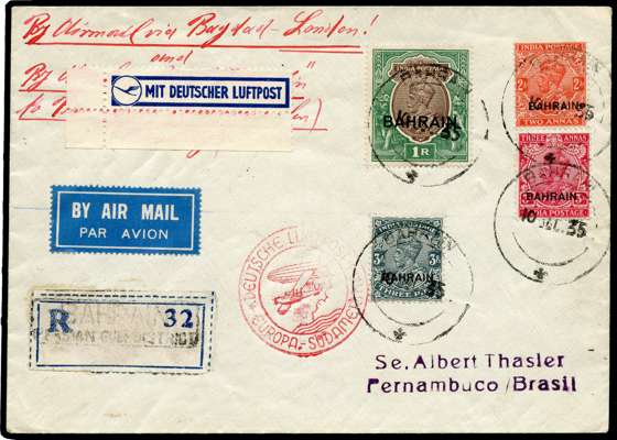 1935 Air Mail cover addressed to Brazil, franked by KGV opts on India 3p,2a,3a & 1r tied by Bahrain cds for 10 JUL, endorsed ‘By airmail via Baghdad-London!' rest of endorsement obscured by German air mail label, with Deutsche Luftpost Europa decorative cachet at foot, backstamped by Berlin Zentralflughaffen cds for 17.7 and Brazil arrival for 21 8, an attractive and rare item. SG 1-12