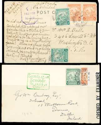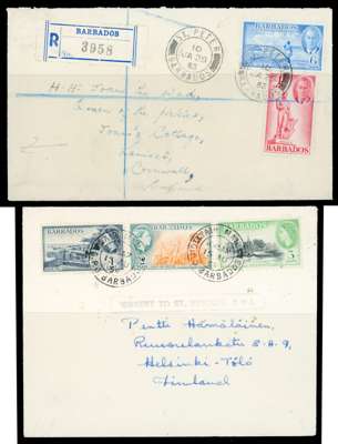 1833-1950s postal history collection, including 1833 pre-stamp entire letter addressed to London rated at ‘2/2', backstamped by Barbados fleuron for 6 MY, London arrival for 13 JUN, 1941 registered cover addressed to Canada bearing ‘THE IMPORT,EXPORT AND CURRENCY CONTOL BOARD ’ cachet in violet, 1942 censored picture postcard, addressed to USA via Trinidad, scarce, 1942 censored cover to Ireland bearing Irish Censor boxed h/s in green, 1959 cove to Finland but missent to St Vincent bearing boxed s/l handstamp, generally fair to fine condition, an interesting lot. (8)