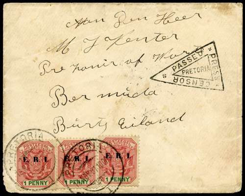 1901 incoming POW mail from Transvaal addressed to Burtts Island, franked by E.R.I. opt on 1d (3) tied by Pretoria cds for 18 NO 1901, with triangular censor mark backstamped by Hamilton arrival for JA 1902, diagonal crease at upper left, otherwise fine, scarce.
