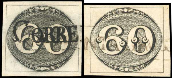 1843 early impression 60(R) black and intermediate (worn) impression 60(R) grey-black, on greyish paper, both with good to large margins, early impression cancelled by straight line ‘Correio Da’ h/s and worn impression bearing 'Ponta Grossa' h/s cancel, very fine examples of these classic stamps. SG 2-5