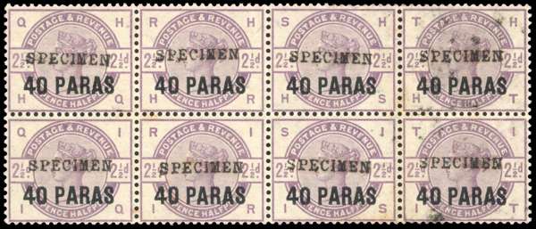 1885 40pa on 2½d lilac block of 8 (4x2) HQ-IT, each handstamped “SPECIMEN”, surcharged from a horizontal setting of eight clichés, of which three showed a small “S”, the four stamps at right show the small “S”, o.g. SG 1S