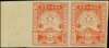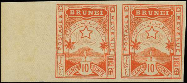 1895 (22 July) 10c orange-red, left marginal IMPERFORATE HORIZONTAL PAIR from R2/1-2 of the one sheet of 50 that existed, unmounted o.g. with lovely colour. Insignificant traces of toning in margin mentioned for accuracy, still very fine and rare. SG 7a cat £3250