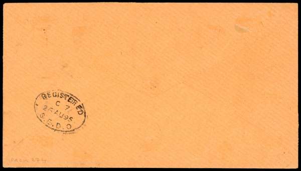 1895 registered "Pead" cover to London, franked by 1895 short set of 7 to 10c, tied by four light strikes of Brunei FIRST DAY cds (22 JULY) in combination with Labuan 1894-96 18c olive-brown (SG 71) tied by Labuan transit cds (JY 25 1895), to pay external postage. Also on face, "R" in oval and curved "REGISTERED/No" (both applied at Labuan) and red London arrival cds (25 AU). Delivery backstamped (26 AU). Some characteristic imperfections (minor tones, Brunei stamps with some trimmed perfs), still attractive and scarce. SG 1-7
