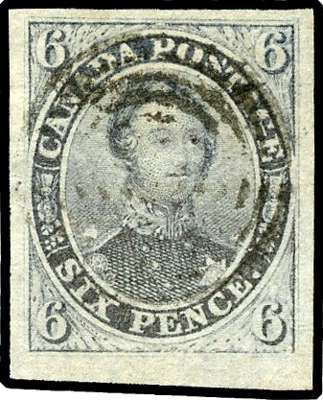 1851 Laid paper, imperf 6d slate-violet, large to very large margins, lightly cancelled by concentric rings in black. Very fine. SG 2