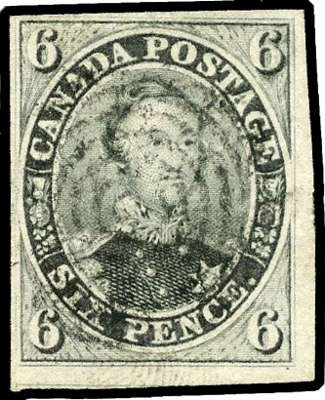 1852-57 Handmade wove paper, varying in thickness, imperf 6d greenish grey, close to very large margins showing part of next stamp at foot, lightly cancelled by concentric rings in black. Fine. SG 10