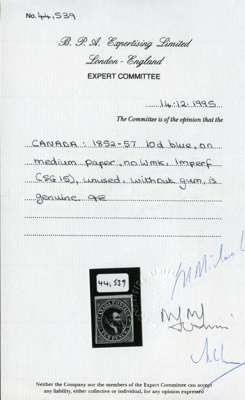1852-57 imperf 10d blue, medium paper, close to very large margins, unused without gum. Very fine colour. BPA Certificate (1995), SG 15