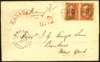 1854 (FE 21) cover from Toronto to New York, endorsed 'Money 4s' and franked at 6d by 1852-57 3d brown-red 'Beaver' vertical pair on wove paper with good to enormous margins (trace of adjoining stamp at left), tied by individual target cancels, with despatch cds at lower left and straight line 'MONEY-LETTER', 'PAID', and curved 'CANADA' handstamps (all in red) alongside. Horizontal filing fold as often (well away from stamps) and left flap removed, still a splendid and very rare showpiece item, being one of just TEN such money letter frankings to the USA recorded in the Wayne Smith census. SG 8