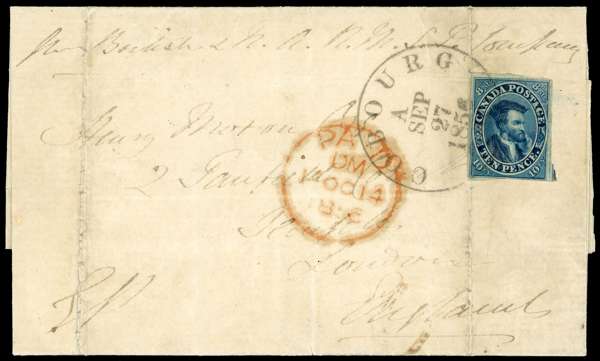 1856 (SEP 27) entire from Cobourg to England, endorsed 'per British & N.A. R.M. S.P. sailing' and carried aboard the 'Asia', franked at the British Packet rate by 1852-57 10d blue 'Jacques Cartier' with good to enormous margins (except just touching at foot but showing portion of adjoining stamp at right), tied by very fine large 'COBOURG' cds which leaves portrait virtually clear, with red 'PAID' arrival cds (14 OC) alongside. Backstamped at Kingston (SP 28). A couple of filing folds as often, and minor soiling, still most attractive with any 10d a rarity cancelled by cds. SG 15 on cover, £4,000+