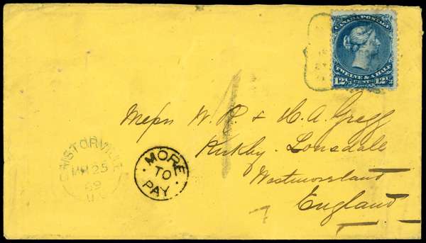 1869 (MR 25) cover from Caistorville to England, franked by 1868-90 'Large Queen' 12½c bright blue, tied by postmaster's private advertising cancel in blue ('M.G. SCOTT / DEALER / IN DRY GOODS / GROCERIES &tc / CAISTORVILLE, C.W.'), with matching despatch cds at lower left. Although correctly prepaid at the Canadian Packet rate, the cover missed the intended Allan Line sailing and was forwarded to New York to catch the first British Packet sailing (under the first packet principle), which resulted in an underpayment of 2½c, the British Packet rate being 15c. The face with 'MORE / TO / PAY' circular h/s and '1' (1d = 2½c) due markings on face, and backstamped at Burton and Kirkby Lonsdale (AP 13). Minor creasing, still a fine and interesting cover.
