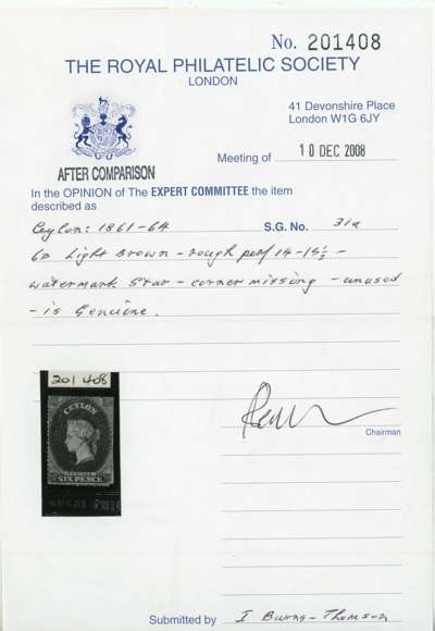 1861-64 6d light brown, rough perf 14x15½ unused (without gum) defective lower right corner, otherwise fine, a collectable example of this difficult stamp. RPSL Certificate (2008) SG 31a £2250