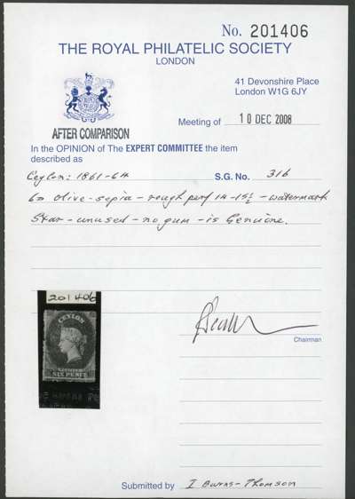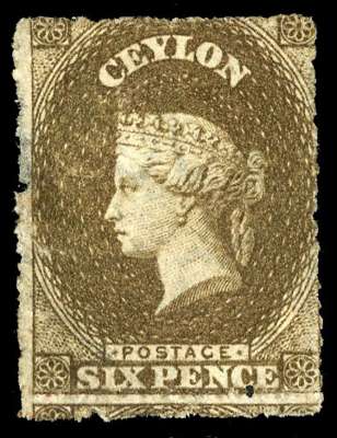 1861-64 6d olive-sepia, rough perf 14x15½ unused (without gum) thinned patch at left and hint of surface rubbing, otherwise fine, a collectable example of this difficult stamp. RPSL Certificate (2008) SG 31b £1200