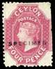 1863-66 4d rose, Wmk CC type 5, perf 12½, handstamped ‘SPECIMEN’ (Samuel type D5), brilliant large part o.g. some trimmed perfs, as often encountered on archival examples, still very fine and rare, with lovely colour. SG 52b,var