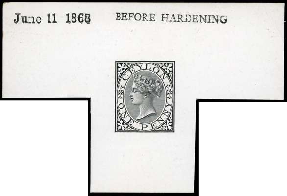 1868 1d die proof in black on glazed card, endorsed ‘BEFORE HARDENING’ and dated ‘June 11 1868’, the card being reduced, with squares (28x30mm) cut away from both lower corners, otherwise fine, a rare proof with the handstamps, most surviving examples being stamp-sized. SG 61var