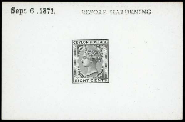 1872-80 8c die proof in black on glazed card (92x60mm) endorsed ‘BEFORE HARDENING’ dated ‘Sept 6 1871 fine, scarce. SG 124var