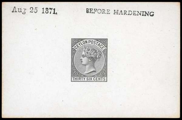 1872-80 36c die proof in black on glazed card (92x60mm) endorsed ‘BEFORE HARDENING’ dated Aug 25 1871, fine and scarce. SG 129var