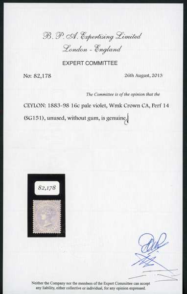 1883-98 16c pale violet, Wmk CA, unused without gum, still a fine example of this extremely scarce and delicate stamp with good colour. BPA Certificate (2013) SG 151 £2000