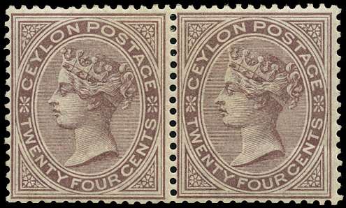 1883-98 24c brown-purple, Wmk CA, prepared for use but not issued unsurcharged, HORIZONTAL PAIR, brilliant large part o.g. Fractionally trimmed perfs at foot and right stamp with minor gum wrinkle, mentioned for accuracy, still exceptional condition for this rare stamp, prepared for use but not issued without surcharge. The only recorded pair, with a classic pedigree. SG 152 £4000+
