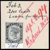 1886 ex De La Rue day book piece (52x53mm) with stamp-sized die proof of 5c value in black on glazed card (with additional m/s annotation in selvedge at foot), endorsed in m/s ‘feb 3. 240 leads 6 extra for repairs’, and further annotation ‘apr 2 94 repeat no 4’ in red, fine archival piece, scarce. SG195var