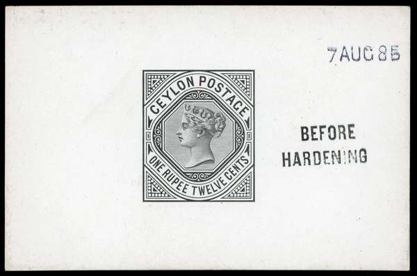 1886-95 1r.12 die proof in black on glazed card (92x60mm) endorsed ‘BEFORE HARDENING’ dated ‘7 AUG 85’, very fine and scarce. SG 201var