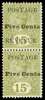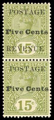 1890 5c on 15c olive-green type 36 surcharge vertical pair, with lower stamp ERROR ‘REVENUE’ OMITTED (with an albino impression present as usual) large part o.g. fine example and desirable in se-tenant form. SG 233e